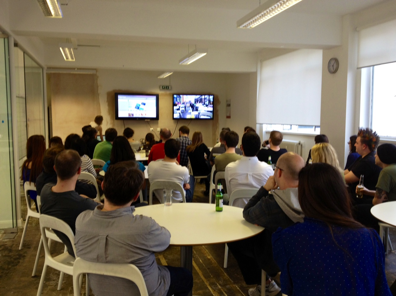 all hands meeting with the UK & US (via video feed) employees at MOO
