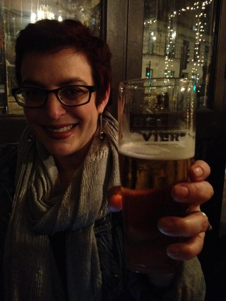 Lori drinking cheap German beer in a British pub. Cheers!